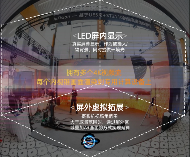 XR即Extend Reality,是在以LED屏为拍摄介质的虚拟制片中加入实时同步的虚拟内容扩展。核心关键点在于屏幕内容跟随视点位置随时变化并实现屏幕外的无限扩展,实时引擎的图像输出和摄影机的追踪能实现同步结合。InFision XR创新性解决了屏幕内外动画同步以及摄像机与虚拟场景位移同步的两大关键难题,做到屏幕内外虚拟场景的无感扩展。