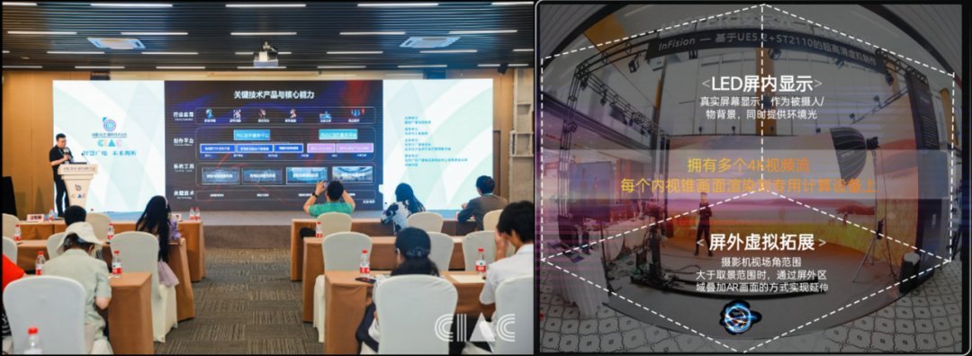 大会同期进行的XR虚拟制作创新论坛中,元客视界副总经理李淼带来超高清虚拟拍摄技术方案分享。超高清虚拟拍摄技术方案,是总台国重实验室联合信游网光·元客视界研发,以LED屏幕为背景的新一代视频制作方式,被逐步应用于“电视台演播室、影视虚拟制作棚、传媒实训室”等场景,采用UE5.2与Rivermax的分布式渲染与合成方式,极大降低了集群中GPU的数量、成本。此外,分布式渲染的数据通过高速IP网络以ST2110协议进行传输,接轨了视频IP化趋势。