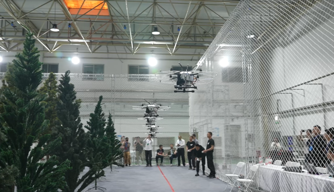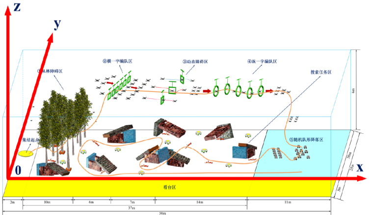 比赛中,设置了包括无人蜂群遂行避障快速集结与协同自主搜索任务。集结任务中无人蜂群需自主选择耗时最短的路径,并且以协同性最好的方式连续穿越多种动态与静态障碍,快速、准确,并按一定的随机队形要求集结至指定位置。