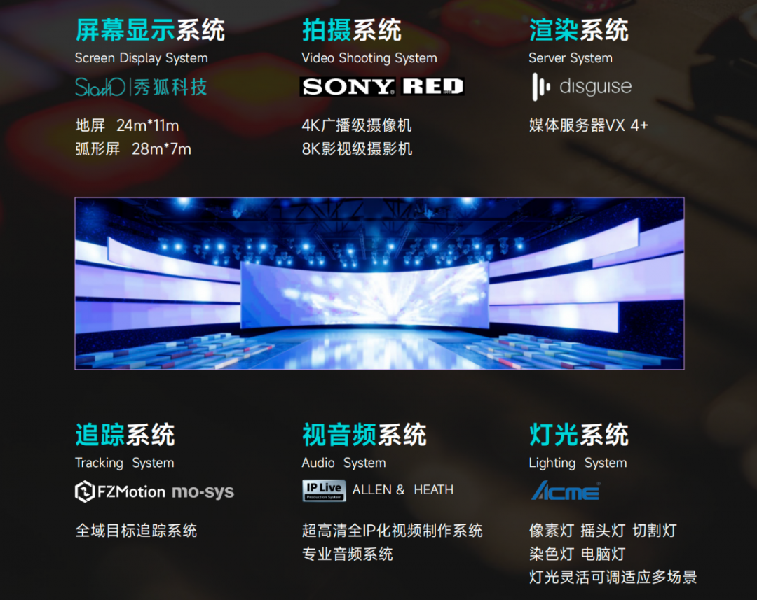 其中,XR演艺制播棚有3000平米拍摄空间,422平米高分辨率LED屏幕,4K广播级和8K影视级摄影机、 国内首套Disguise VX 4+媒体服务器、FZMotion和Mo-sys全域目标追踪系统,以及超高清全IP化视频制作系统、专业音频和全套灯光系统等,打造可媲美好莱坞虚拟制片标准与流程,可实现虚拟置景及实时渲染、实时合成、实时预览,可为导演和演员提供更多的创意空间和更高的拍摄可靠性。