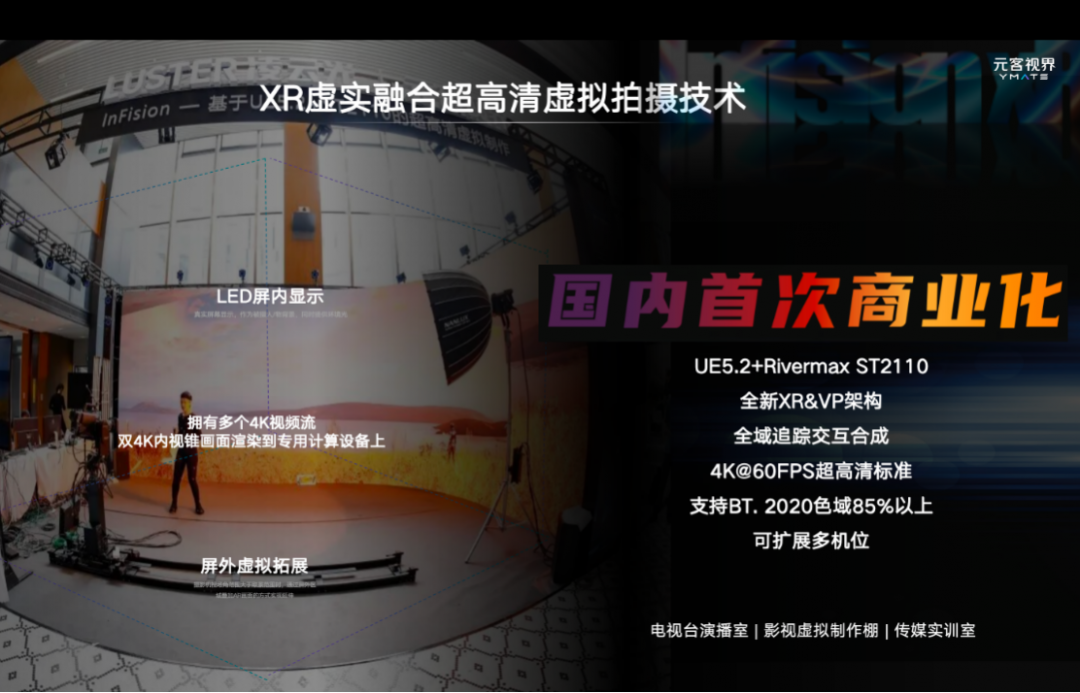 “相比传统摄影棚拍摄,具有更高效率、更低成本等优势,代表了未来影视摄制的发展趋势。MAC采用元客视界自主研发的超高清虚拟拍摄方案,兼容UE5.2最新版本以及ST2110时码同步,结合Rivermax的全新架构,采用分布式渲染减少高性能GPU配置需求;同时,可支持全域目标追踪和实施交互合成,一套系统完成多台摄像机、交互道具等跟踪;支持4K@60fps超高清标准;BT.2020色域覆盖度达到85%以上,期待更多影视、广告、视频、游戏等元宇宙虚拟数字内容创作者来我们基地产出更多好作品,为用户带来更加震撼的视效体验”元客方舟 MAC元宇宙演艺制播科技中心负责人曾义介绍到。